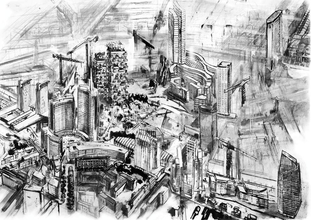 C’è poi il futuro, che si intravede nei grattacieli di PORTA VOLTA UNICREDIT e di CITY LIFE, che Santosuosso rappresenta in pittura da quanto ancora erano dei cantieri, basandosi solo sulle planimetrie dei progettisti.